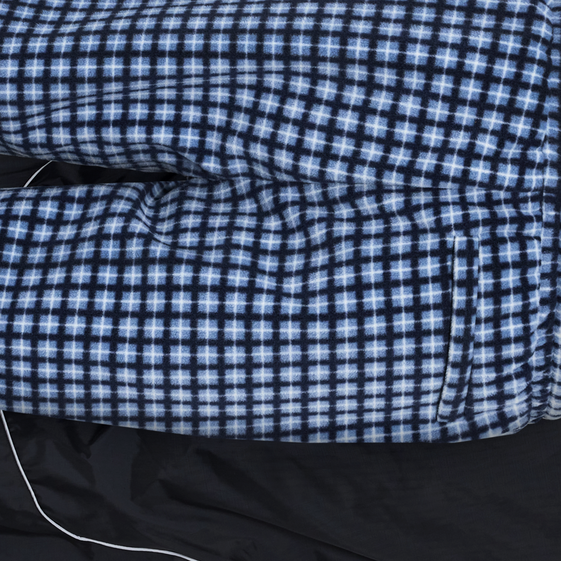 Featuring one side with poly midnight navy shell & reflex linings. The other side features a checkered fleece shell.